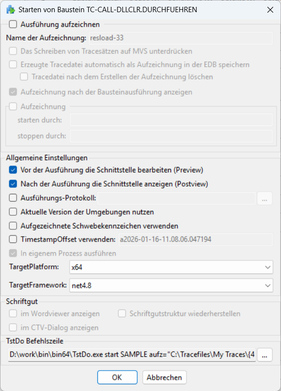 Sie haben in TestEdge die Möglichkeit, einen Bausteinaufruf auszwählen, und diesen ausführen zu lassen. Die Parameterobjekte des aufgerufenen Bausteins werden dabei mit den Daten bestückt, die lt. Aufzeichnung bei Eintritt in den Baustein vorlagen. Es wird der folgende Dialog angezeigt, in dem Sie diverse Einstellungen zur Ausführung anpassen können. Aus den Angaben wird ein tstDo-Befehl erstellt und ausgeführt. Die änderbaren Einstellungen entsprechen deshalb auch größtenteils Optionen für tstDo.